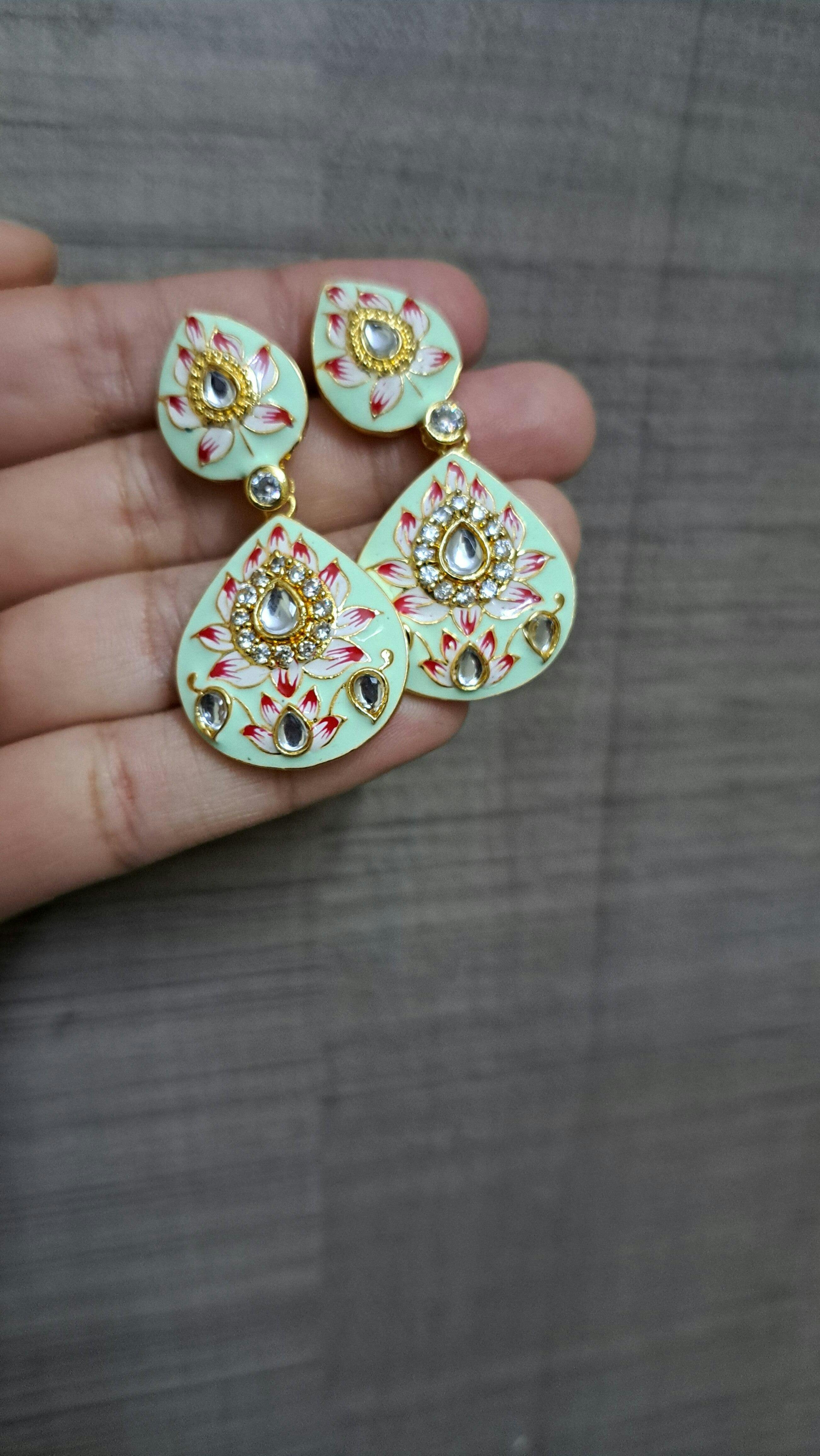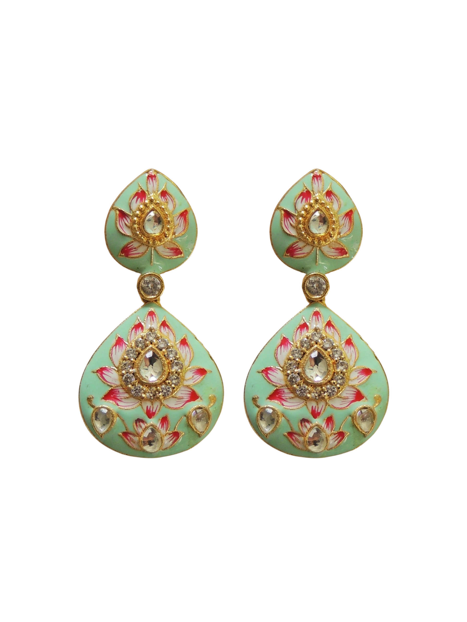 Discover the exquisite beauty of these Double Paan Mint Lotus Meenakari Earrings. The intricate details of a handcrafted lotus design are adorned with Meenakari, creating an elegant statement piece. This stunning piece of jewelry is sure to elevate any outfit.