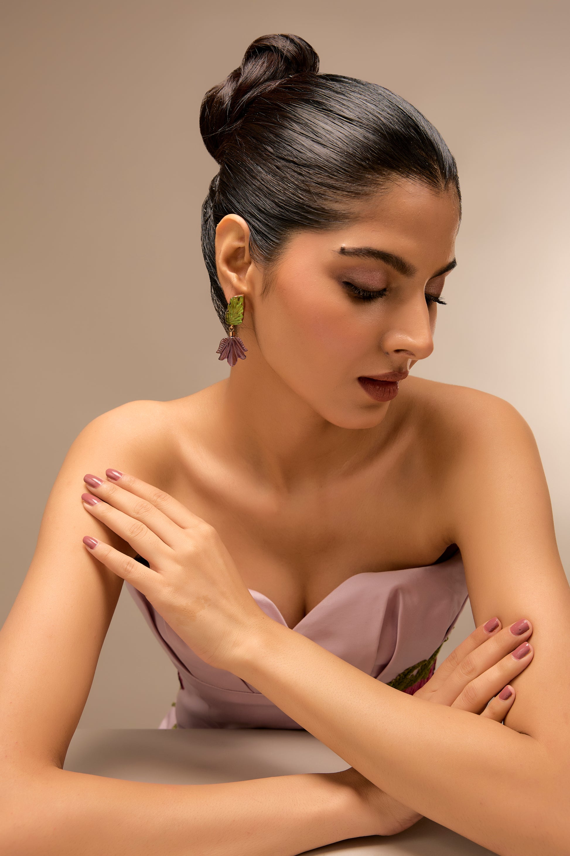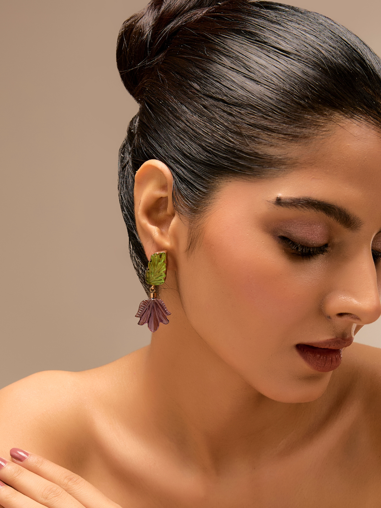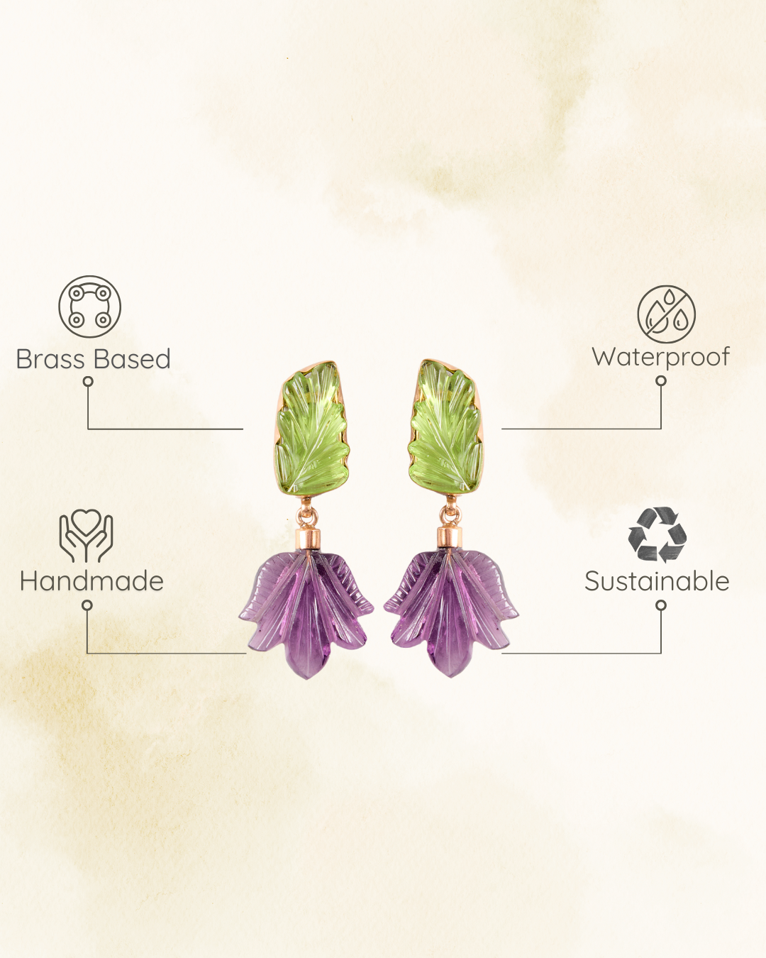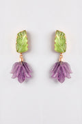 These nature-inspired earrings feature a delicate green leaf-like top that gracefully leading to a carved purple bloom. The combination of colors and organic shapes brings a touch of natural beauty to your style. Perfect for those who love unique and artistic jewelry.