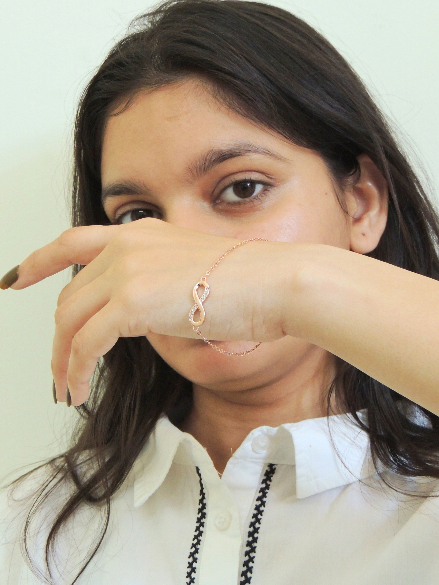 Elevate your everyday look with the Infinity Bracelet – Rose Gold, designed for the modern woman who values elegance with ease. This lightweight and minimalist piece brings effortless style to your wrist, whether at work, on a date night, or catching up with friends. Its sleek infinity symbol adds a subtle charm, while the waterproof, non-tarnish rose gold plating ensures lasting brilliance, day in and day out. Stylish, durable, and surprisingly affordable, it’s the perfect go-to accessory for women aged 18 to 27 who love fashion without fuss.