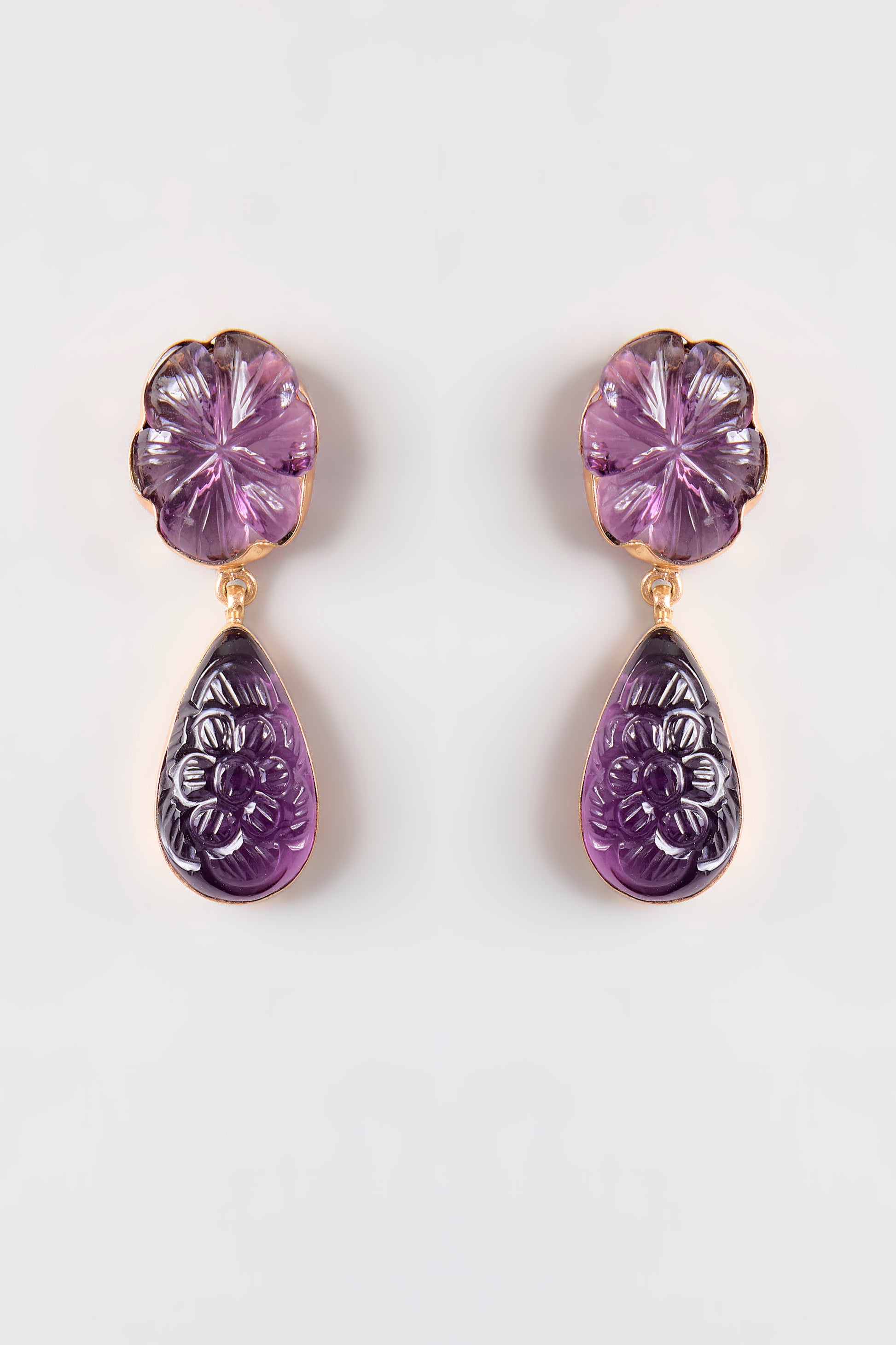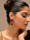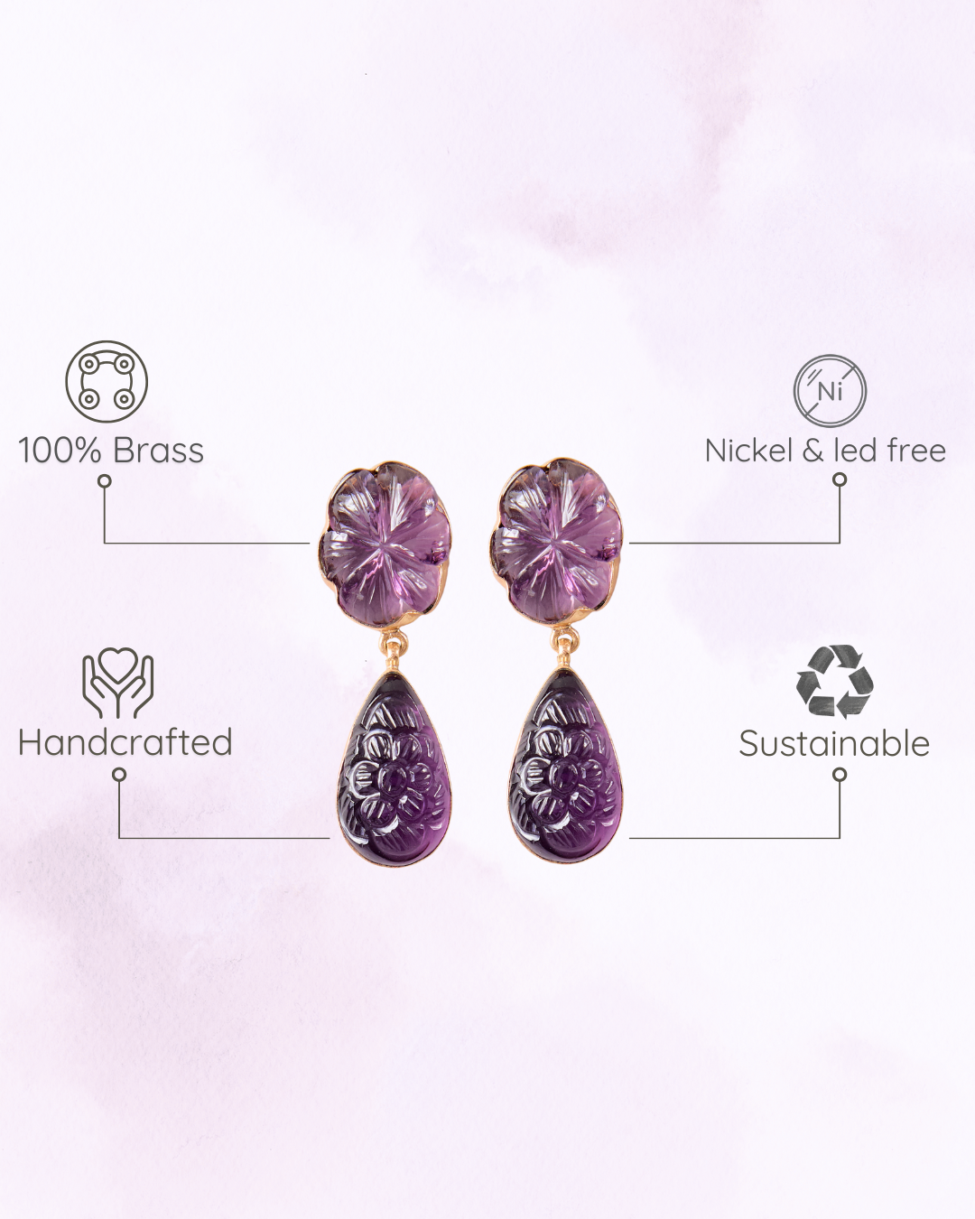 These dusky purple earrings have a pretty carved flower on top and a teardrop below. The deep amethyst color gives them a rich and elegant feel. They’re great for adding a little mystery and beauty to your outfit. Perfect for both day and evening looks.